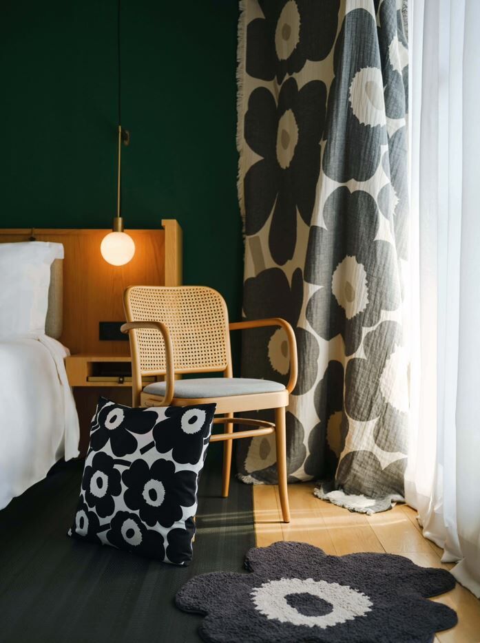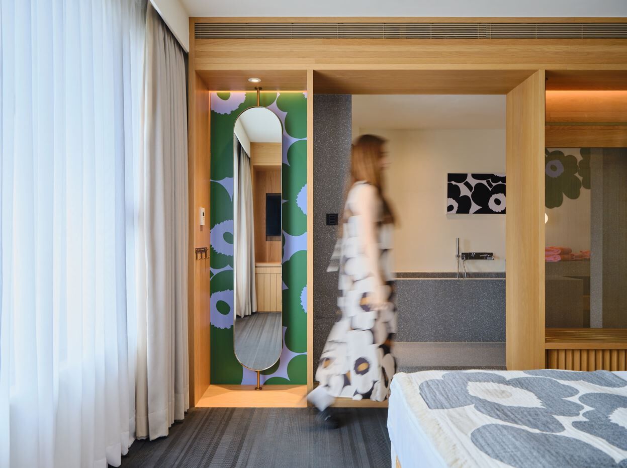當 Marimekko的印花語言遇上金普頓大安設計優先的生活美學,【仲夏花漾藝境 Stay in Bloom】 不只是住宿,而是可被觀賞、被停留、被使用的沉浸式體驗,Unikko 游霓可印花 ,以經典黑白與春夏亮綠交織穿梭在充滿東方寫意的客廳、房間以及浴室。